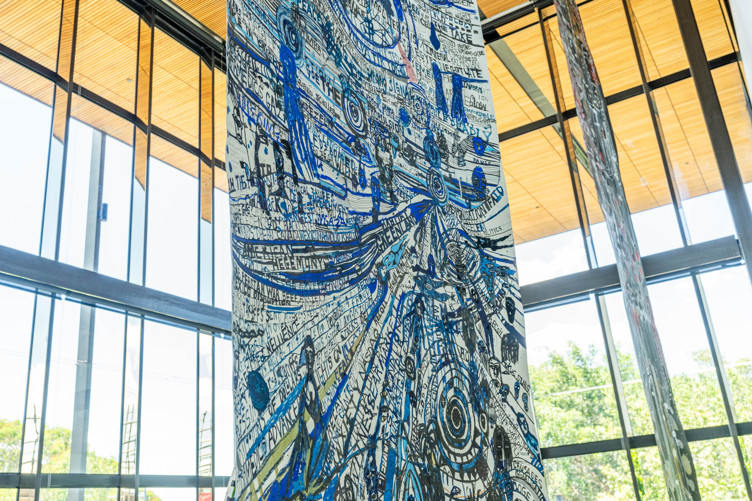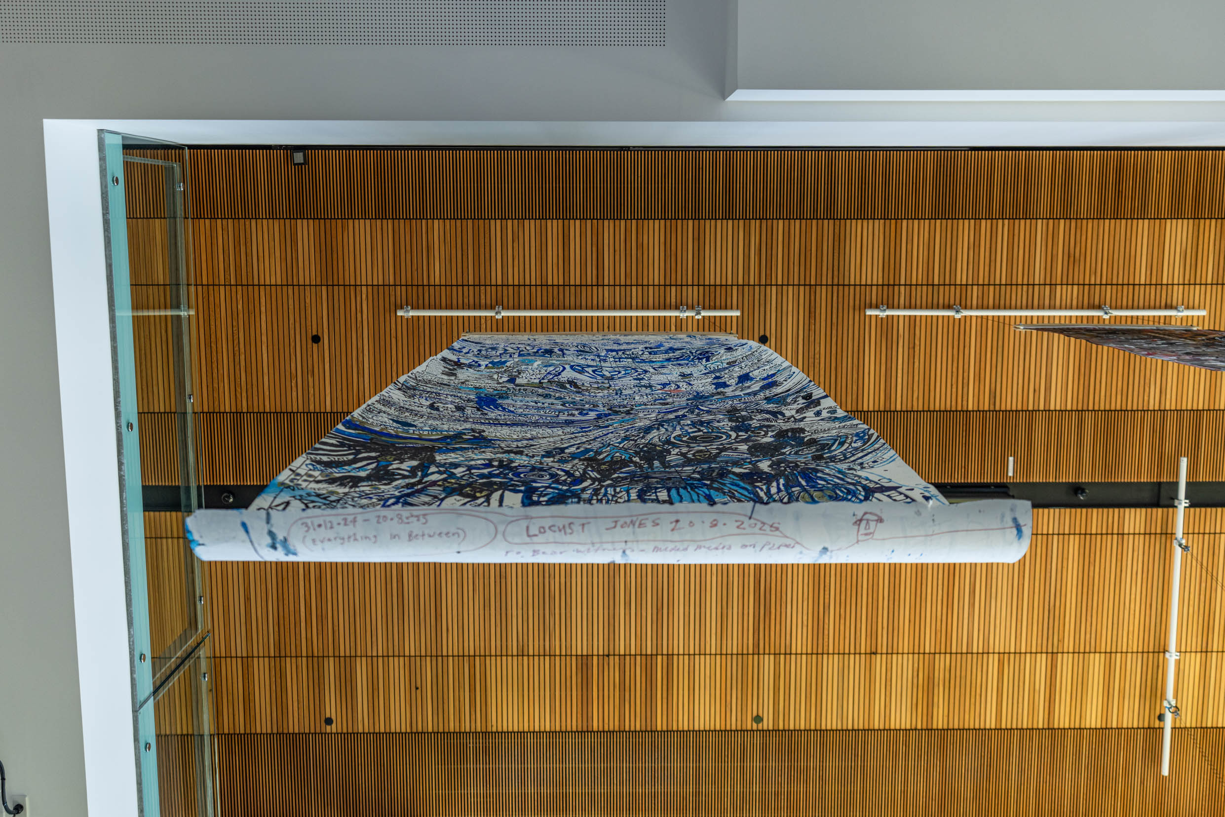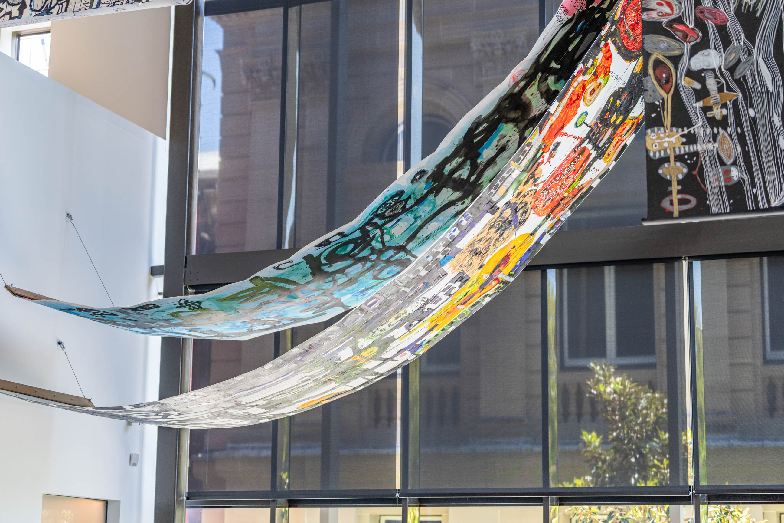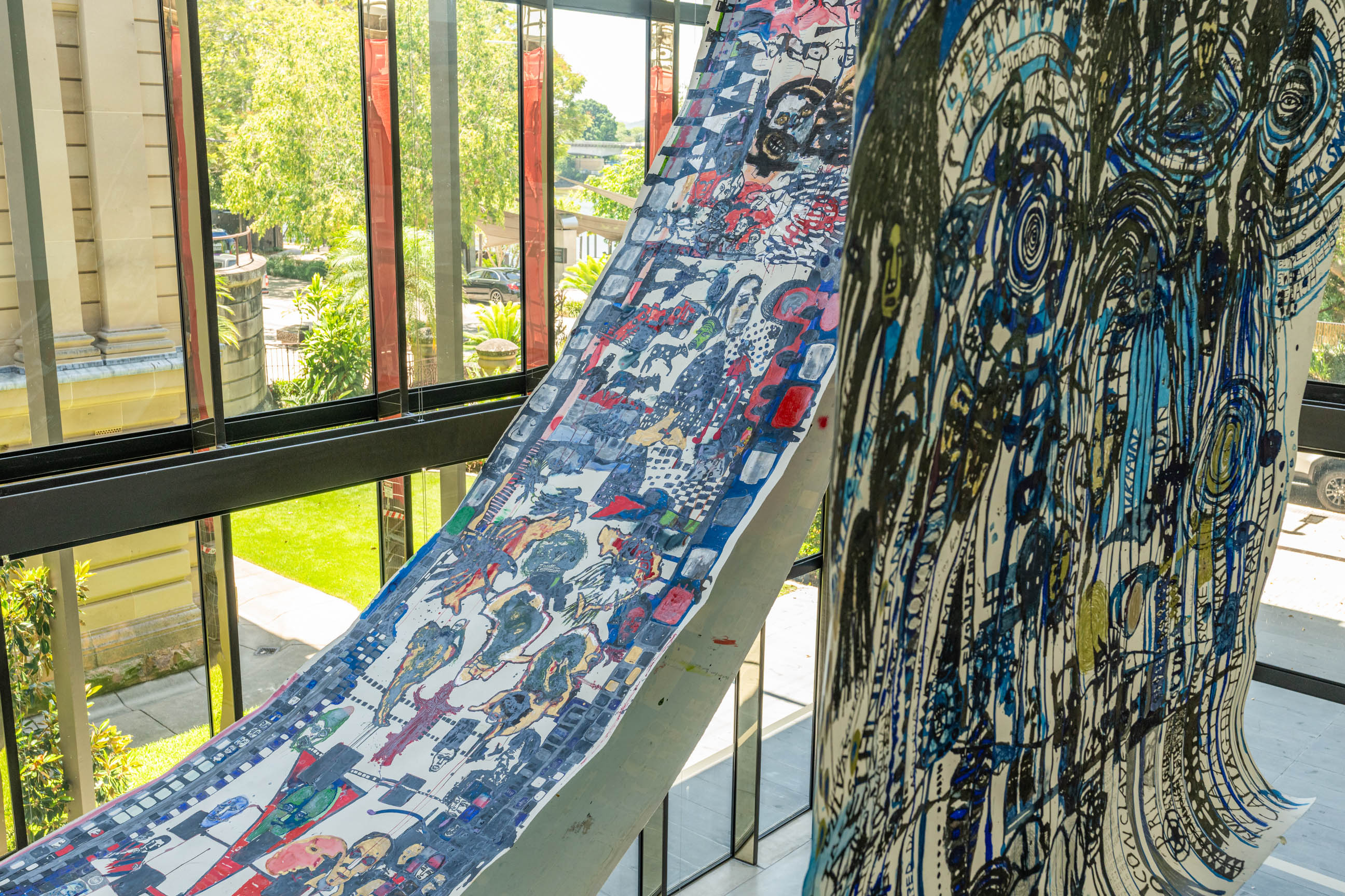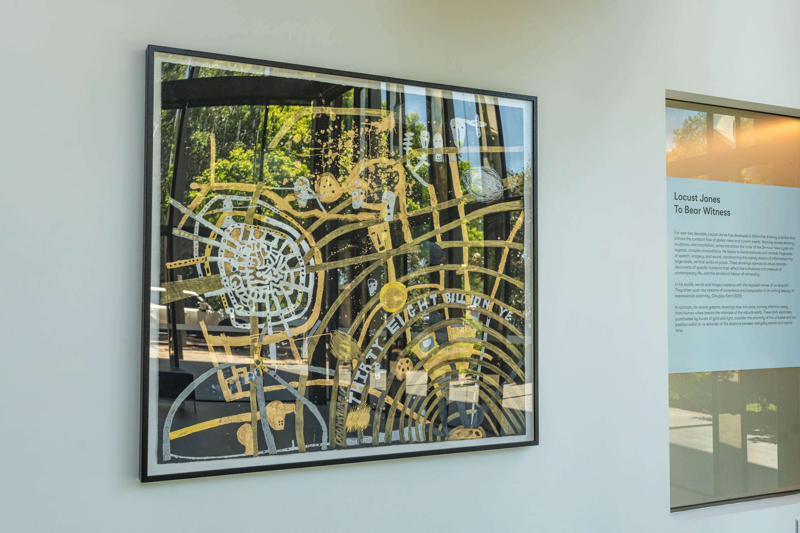 For over 20 years, Locust's practice has woven layers of stories and images that replicate the frenetic pace at which society consumes everyday news and current affairs, in a variety of mediums. To Bear Witness will feature large scale vertical drawings cascading through RMOA’s Atrium Gallery.